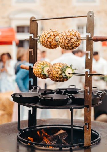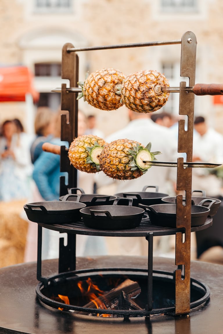 Ananas rôtis (longuement confits au brasero ou au four) pour un goût sucré et aromatique.